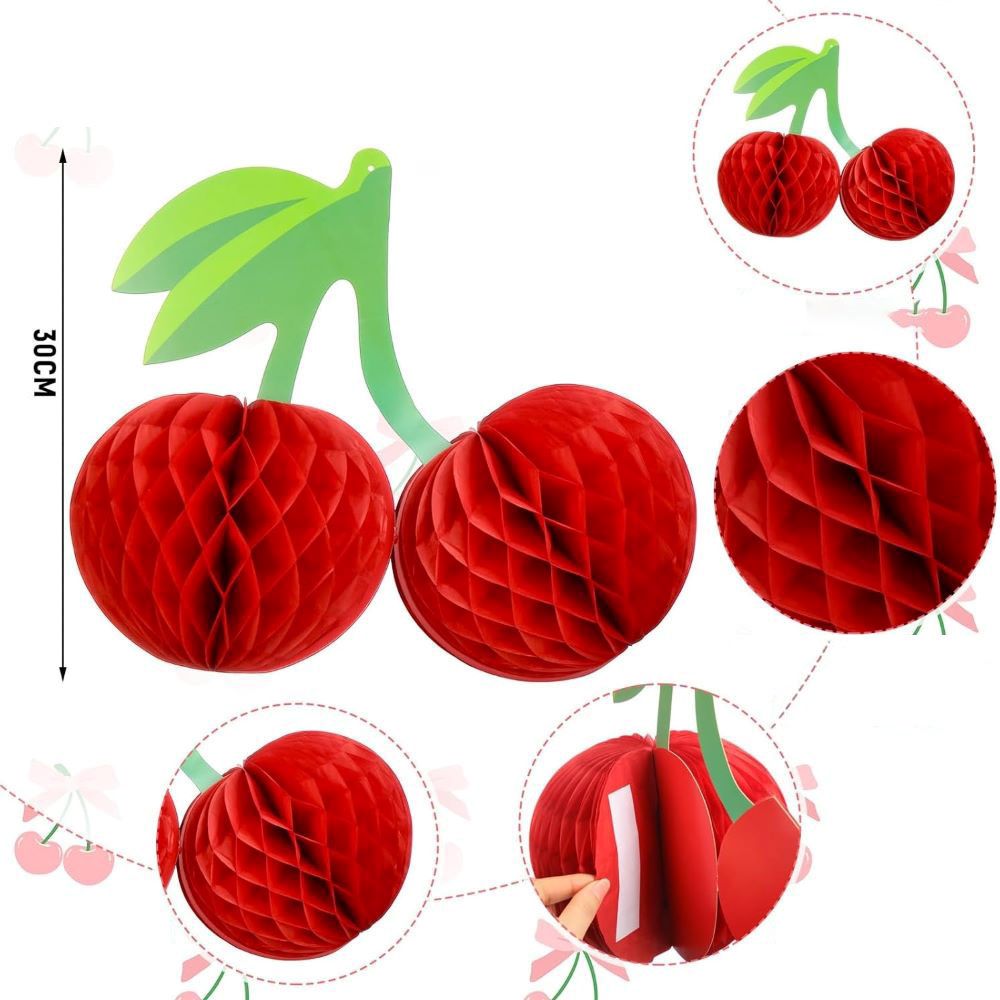 Объёмное украшение в форме вишни — лёгкий и выразительный элемент праздничного декора. Плод выполнен из нежной бумаги тишью, создающей воздушный объём, а веточка и листья — из прочного картона, что обеспечивает устойчивую форму и аккуратный внешний вид.