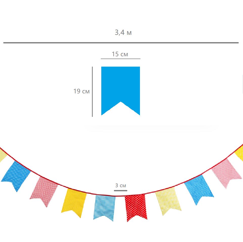 Гирлянда состоит из 12 флажков, общая длина составляет 3,4 м, расстояние между флажками 3 см, длина матерчатых флажков 2,1 м, длина лямок с обеих сторон по 50 см
