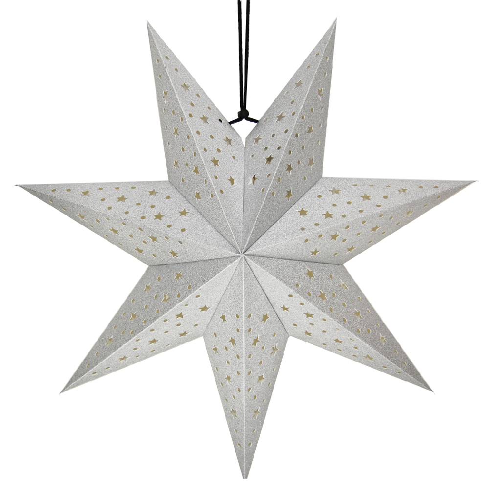 Семиконечная объемная звезда 45 см — великолепный декор из тонкого перфорированного картона с серебристыми блестками. Создает красивые световые эффекты. Поставляется в сложенном виде, в комплекте шнур для фиксации объема и подвеса.